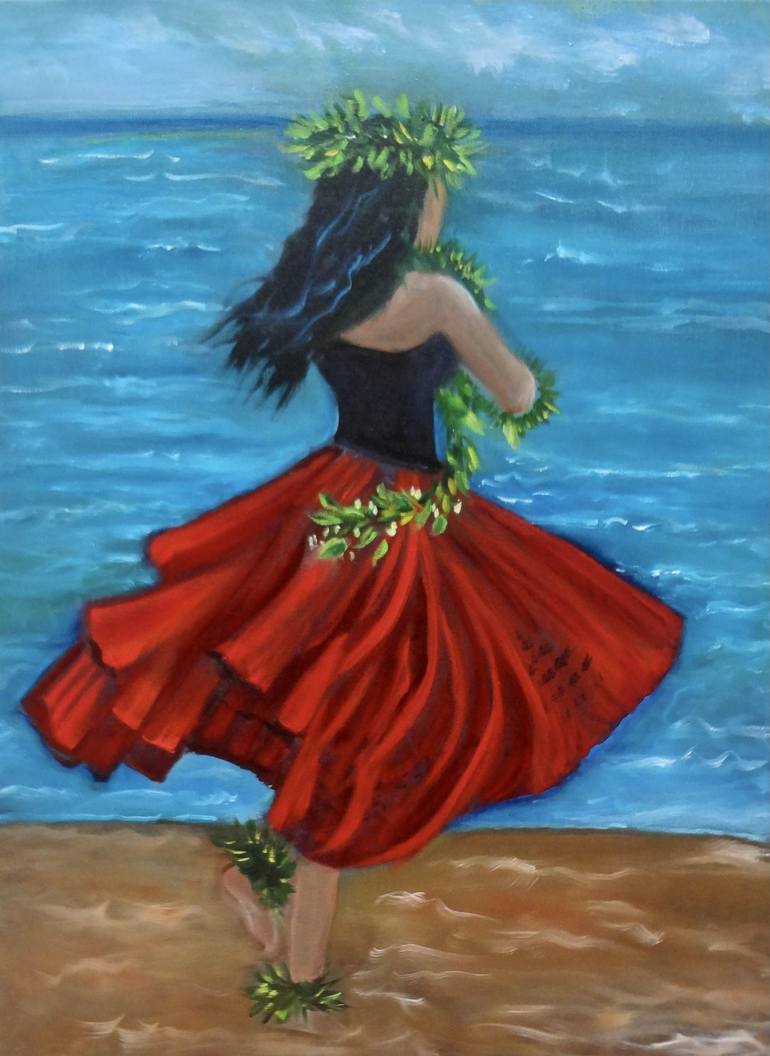 Original oil painting on stretched canvas. . Framed in a custom white lacquer wood frame with gold trim ready to hang. Swirling red skirt wafting in the breeze on the beach at Waikiki.