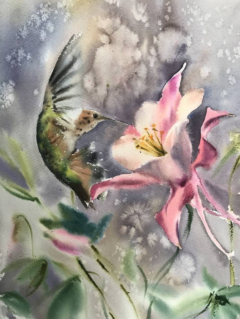 Little hummingbird and flower 12 x 16 in Certificate of Authenticity is included Unframed. All paintings are packed in a reinforced envelope for better protection.