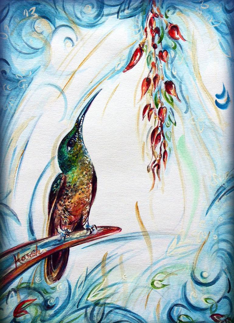 I painted this humming bird water colors painting feeding on red flower. I tried to support the atmosphere with ornate designs. In addition to my work posted here, I accept custom orders in any size and style! If you have any questions, please don't hesitate to contact me: Thank you for stopping by...