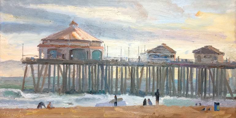 This is a 'plein air' painting which means I set up my easel on the sand there in Surf City USA and go for it on the spot. Made famous by the Beach Boys. A slice of light and life with some surfers for your art collection!