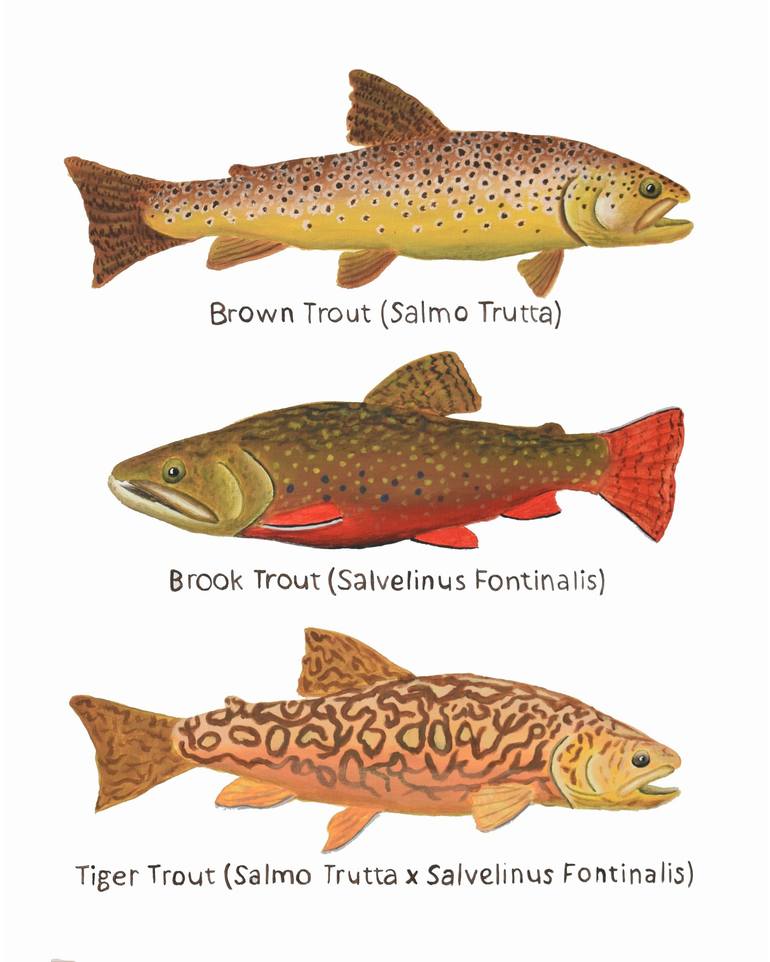 This piece shows the two trout species (male brook trout & female brown trout) mated together to get tiger trout. I enjoy fishing for all three of these species as each one is beautiful and so fun to catch! Enjoy :p This painting would be great for any outdoorsman/ angler as these 3 trout species a...