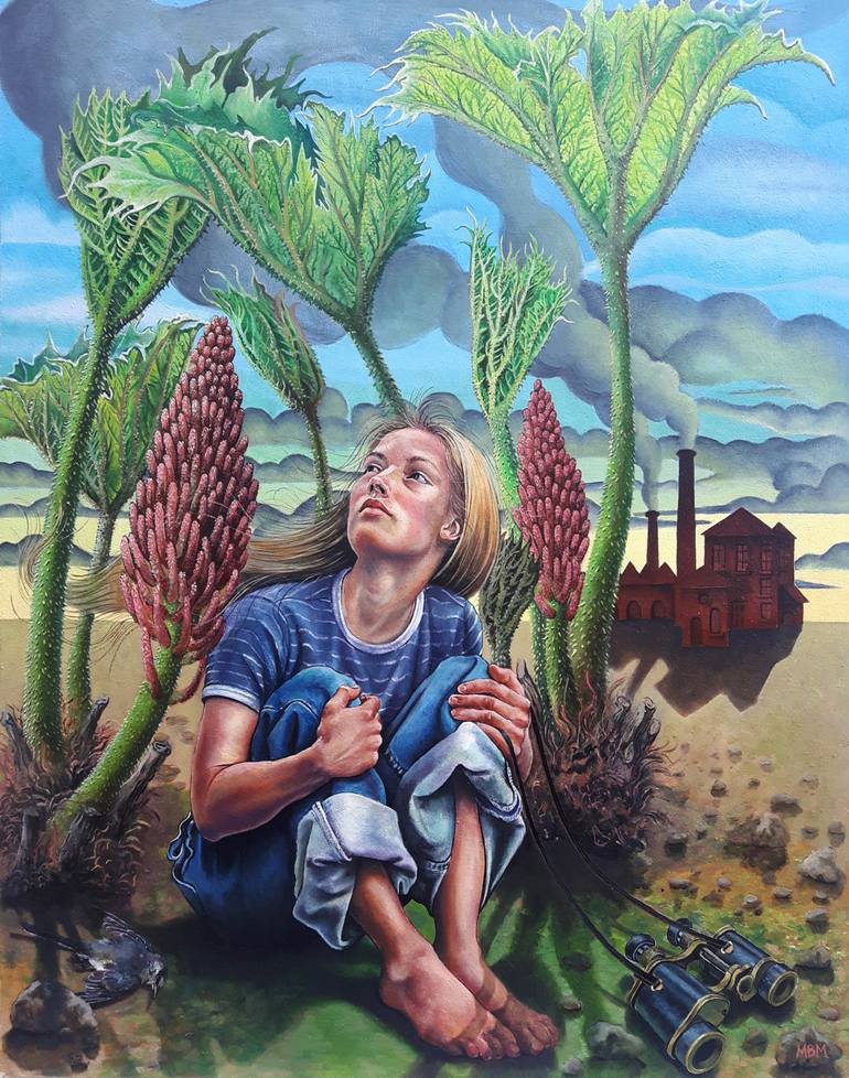 'I Can't See The Chimneys From Here', Oil on board. "This figure composition has a narrative, one which challenges us to raise our awareness of environmental issues such as pollution".