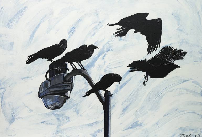 I do love a good Christie novel or Hitchcock film, also funny plurals of animal groupings. What does the bottom crow see of such interest? Wood strip frame stained Mahogany built by the artist.
