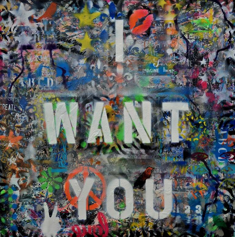 I Want You is my new painting for 2024- 2025 collection. We all need each other to function in any relationship. I want you, I Love You, I Need You, I Love Me, all coincides to live in harmony. 36x36 - acrylic, spray paint, mixed media on canvas. New addition to my word series.