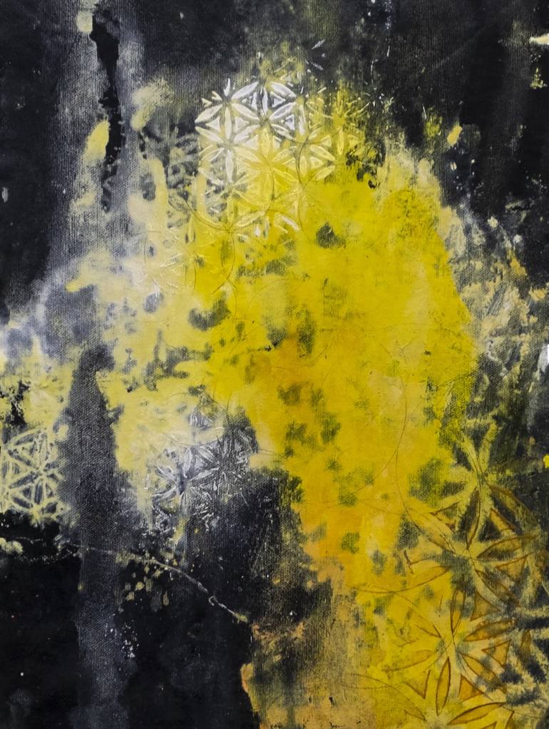 There are 7 small paintings that I created to learn, explore, and figure out how I would approach the large 'main' Drishti Paintings for this exhibit. For these small studies, Little Drishti’s, as I call them, I experimented with colour layering, various mediums, integrating sacred geometry flower o...