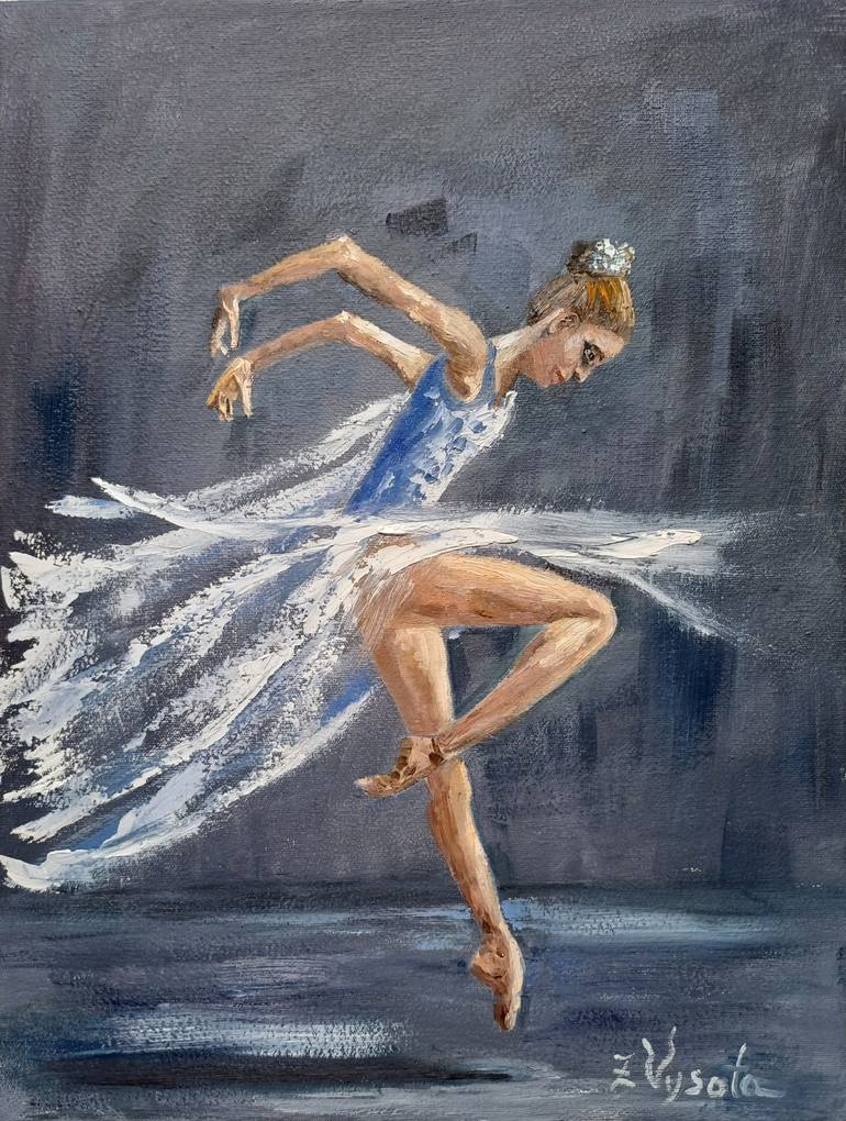 ---" I am where my wings are". The oil painting depicts a ballerina in a white dress against a dark background. Her graceful pose stand out in contrast with the dark backgraund, emphasizing the ease and beauty of movement. A white dress symbolizes purity and perfection, crea...