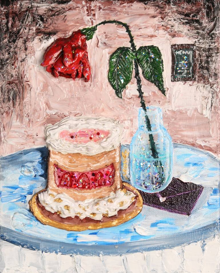 This charming painting reflects my sculpting skill, contrasting my inability to bake cakes. It features a sculpted rose in an epoxy resin vase, an intricately sculpted cake with acrylic whipping cream, and an epoxy resin 'gelly' layer hiding painted strawberries. The setting is a restaurant with a m...