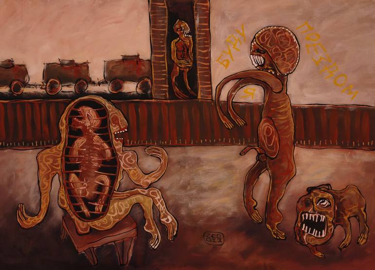 Eduard Zentsik was born in Sillamae, Estonia. Painter, photographer, graphic artist, designer, author of installations, performances and musical improvisations. Organizer of youth exhibitions and projects. For over years of creativity had more than fifty personal exhibitions and took part in numerous joint projects. Participant and winner of international Photographic and Art competitions. Numerous works are in private collections around the world. Apart from the artist's stylistic assuredness and the embedded narratives that one might deduce from seeing bold images of Eduard Zentsik, the artist is primarily fascinated with ontological investigation. Meshed within this overriding motif is the artist's work that insists on fabulous implausibility that fills the mind with haunting hallucinatory and often visionary excesses. This work can only emerge out of a visionary understanding of the cultural context and the inner workings of the present state of the world. But it would also be accurate to say the artist's vision has a tragic undertone. And it is this undertone (in spite of the often bright coloristic applications insinuating an uncanny admixture of surreal adumbration and outsider art with Pop Art surface treatments) which gives the artist's work its edgy feel, its haunting authenticity. In this case, it is appropriate to recall that the term "outsider art" was coined by Roger Cardinal as an English synonym for art brut. The viewer will also discern through Zentsik's visual notations that the artist is concerned with the idea of mutation and metamorphosis. This is a type of writing, in the broad sense, in which the canvas is used very much as a sheet of paper as a type of mystic writing pad on which, if we are to believe Freud, is a model of the psyche. Zentsik juxtaposes different realities allowing the mind to find integration in dissimilarity, in a dramatic cathartic interchange of worlds that blend the symbolic, the real and the imaginary. The artist pits together a near claustrophobic intensity of enclosed space in which we see a great liberating conflagration of surging elements (often competing humans, animals and other creatures) struggling to assert themselves. These entities form part of and are set-off from what appear to be vast expanses of other-worldly terrain that are meant to defy human needs and desires.