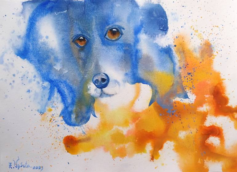 --- I'm Waiting For You. The watercolor painting is a gentle portrait of a blue dog, radiating warmth and joy. Her soft, fluffy fur and unforgettable gaze captivate the viewer"s gaze; the background, made in delicate ranges of orange and yelow, creates an atmosphere of calm ...