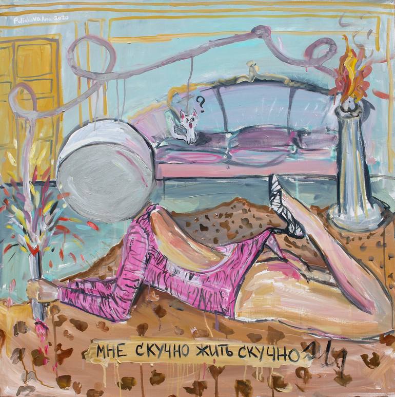 This painting is part of my space series of artworks. I like the combination of irony and sexuality in art. In my paintings I draw cosmic helmets and use attributes that reflect modern life. Space is infinity, energy and emptiness. Here life begins and dies. The female body is sexuality and continua...