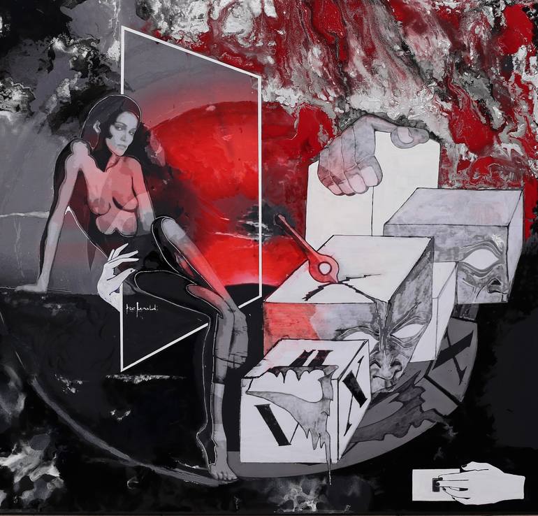 I INQUIETUDINE -nude with cubes - mixed media on canvas 80x80 cm. Cultural apocalypse Mental places, imagined territories on the border between reality and fiction. The combination of bodies, shapes, colours and spaces, in a suggestive landscape with the presence of a female body in a surreal scene...