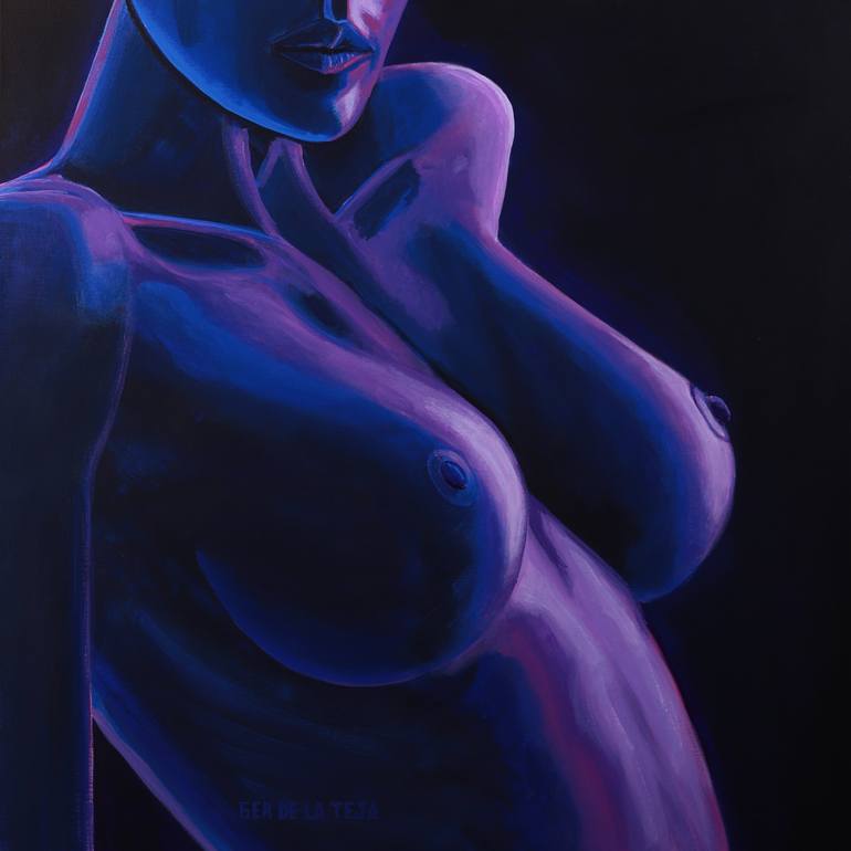 A close composition on a nude female figure highlighting her breast and chin with neon-like highlights over heavy, deep shadows.