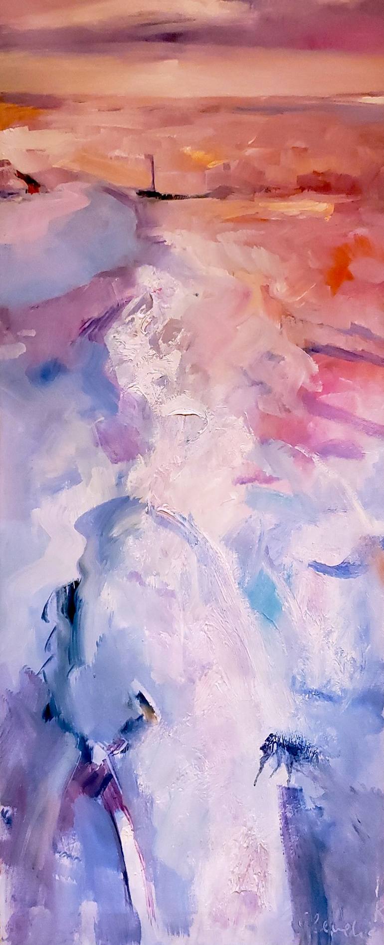 Claudia Kusznirczuk is a professional artist/painter employing the classic oil and acrylic techniques. Although initial attempts at art started in Romania, it was later after moving to Vienna, Austria that Claudia further developed her innate talents and love of Art. Claudia completed a MA Painting degree at the University of Arts London (Wimbledon College of Arts) in 2019. Experimenting with a number of techniques and genres, Claudia quickly grew to love and paint on large format canvas. Painting in the contemporary style, the larger format creates its own particular ambiance, interpretation and effect when hung in large open spaces. Wide open spaces and nature’s abound are of utmost importance to her inspiration, expression and views within her work. The paintings are characterised and filled with spontaneity and brilliant bursts of colour in highlighting a scene, figure or site mostly possible on major image formats, allowing the viewer to take in a great expanse of richly coloured landscape while drawing the viewer’s attention to their own fascinating spot on the picture. The rich variety, exchange and interplay of colours combined with a play of shades of light, intermingling of figures and landscapes in various states of emotion set the mood and offer the viewer a calming state and charm of time standing still while the eyes hungrily consume the brilliance of the art. The original reason for Claudia’s passion for art was the feeling of serenity combined with ability to be expressive and creative in her own view and perception of the world. When adding colours to a white canvas, Claudia indicates that she loses sense of time when painting, and often focuses on every stroke and detail of colour. “I layer my painting each time carefully observing this how this blank canvas transforms and generates an array of emotions. I love painting on large canvas, because it feels like a wide open window to another dimension and place. It gives me the sense of freedom in my creativity. I let my feelings guide me without consciously knowing what will come of the next stroke. I surrender myself to the moment and let it show me the way. At times when I have a certain visual image in my head, I still let the inner voice guide me. I adore the feeling and sense of the flow of wonderful energy go through me when I am involved in my painting.