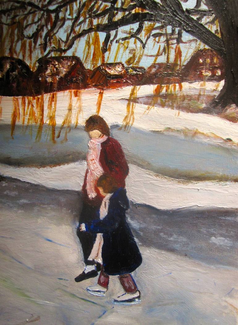 A small oil of a mother and a daughter. The inspiration is from my childhood. The winters in the Netherlands used to be cold and ice-skating was part of winter. The sides are painted as well.