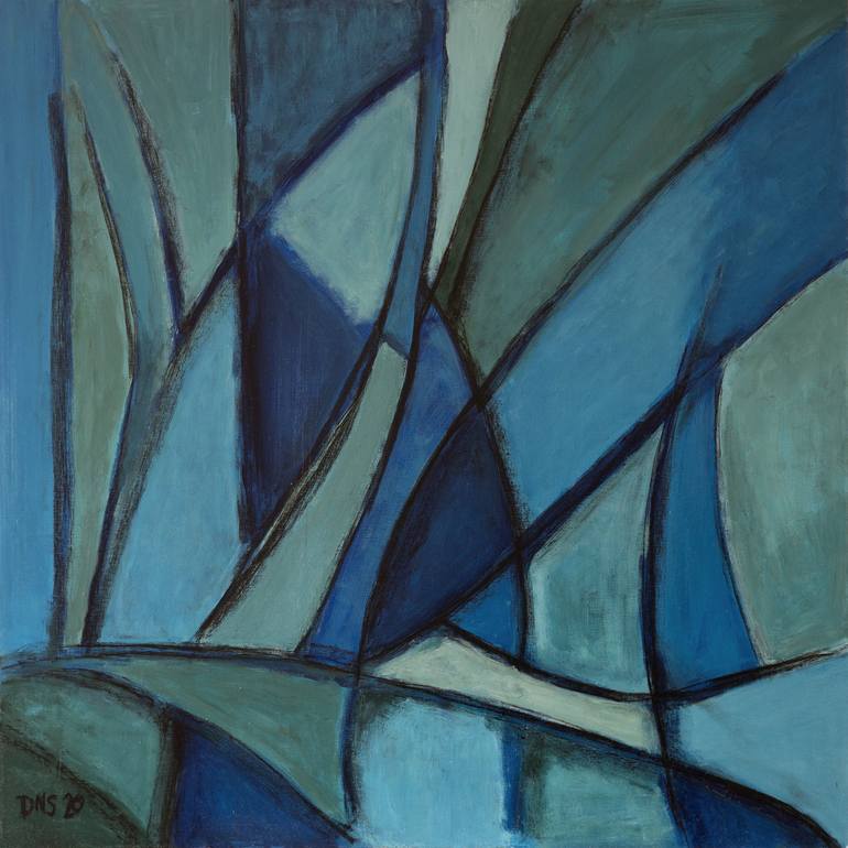 "Icons/senses I" is an abstract painting made with acrylic paint and charcoal. The theme is about fragmentation and memory. The colors and shapes repeat, yet are disconnected and distinct due to the crossing lines that divide the composition. The work is painted on hardboard wood panel.