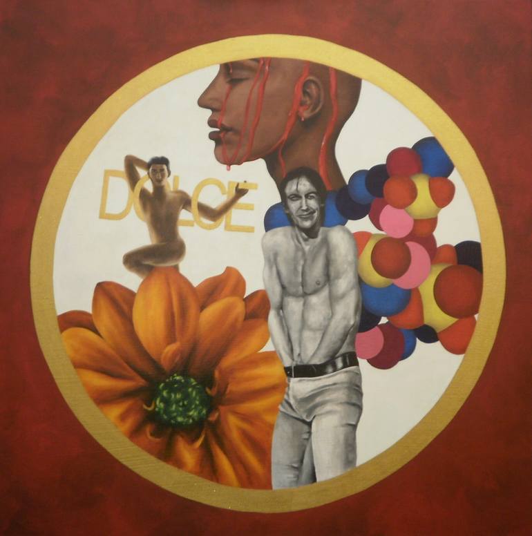 Painted images from popular culture, including the famous photograph of Iggy Pop taken by Stephanie Chernikowski, as well as advertising images from Dolce & Gabbana and an Italian beer, are arranged in the form of a collage. The DNA double helix spiral structure and the oversized flower referenc...
