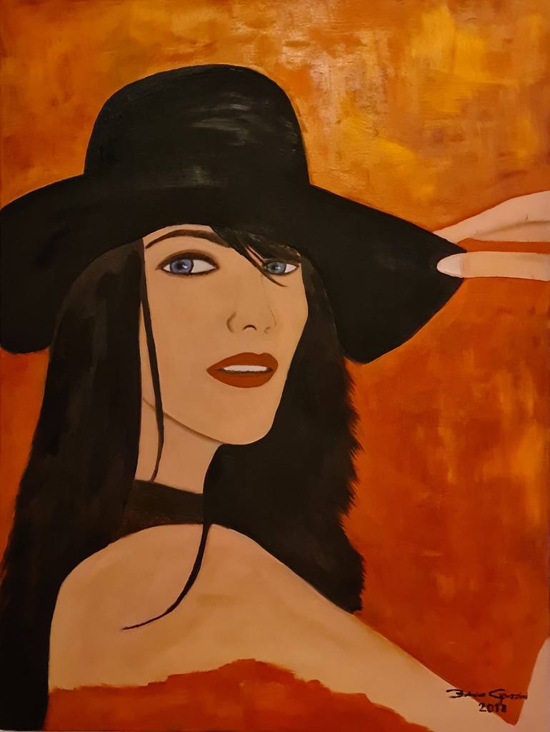 Glamour image with a model looking at the smiling observer, holding the brim of a large dark-colored hat with her right hand, on an orange background.