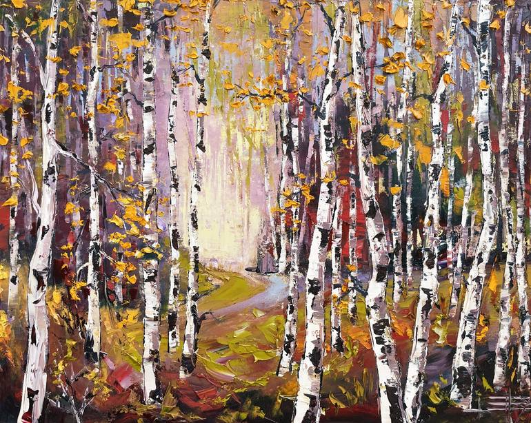 A textured Deep Impasto palette knife painting in oil by an award winning San Francisco Bay artist, featuring a colorful and textured birch tree landscape painting. This painting was inspired by my memories of my childhood in rural New Zealand, where the silver birch leaves crackle underfoot in the...