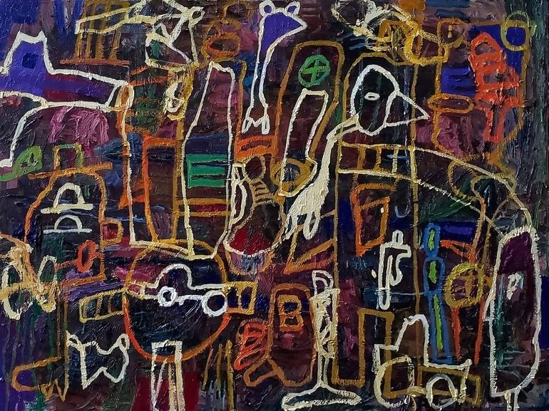 Horizontal medium large sized canvas. An orgy of line work over a riot of color. Thickly painted. Childlike drawing of birds, cars and absurd heads feels like neon lights glowing. A painting which never calms down, settles or goes to sleep. Alternative photo of painting conjectured in an interior s...