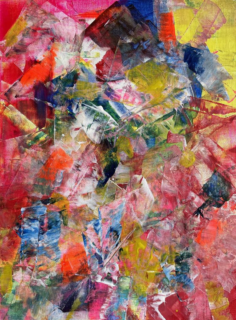A painting in abstract acrylic is an explosion of shapes, textures, and colors that invite personal interpretation. Across the canvas, dynamic and free brushstrokes intertwine, creating layers of depth and movement. Vibrant tones, like intense reds and radiant yellows, contrast with shadowy areas in...