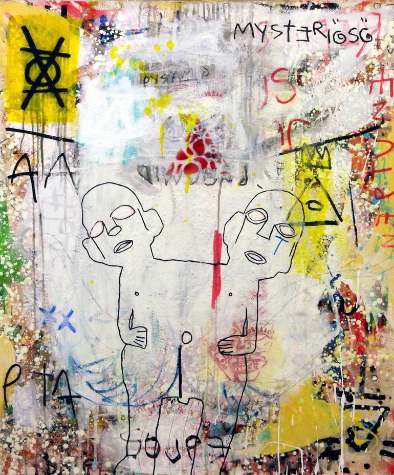 Paintings build with multiple surfaces, one upon the others. Palimpsest of symbols, words, numbers, anthropomorphic figures, hidden signs, magical talismans in bright and primary colors. Confronting alchemy, magic, symbols, with modern society concepts such as advertising, politics, mass consumption, mixing all the graphic elements in a "cut up" painting, looking like collage. Saturation/chaos from wich emerge an equilibrium of characters, words and ideas. The work is influenced by primitive arts : Aboriginal, African, Oceanians, Picasso, Basquiat, and street. Personnal website at :