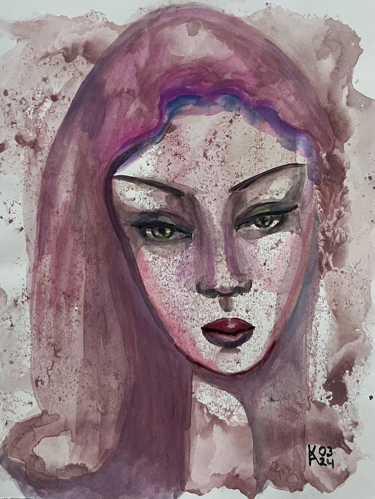 "Immaculate" presents a striking watercolor portrait that embodies feminine perfection and ethereal beauty. The subject's face is rendered with a remarkable interplay of purple and rose tones, crowned by flowing burgundy hair. Her piercing green eyes and deep burgundy lips create focal points that d...