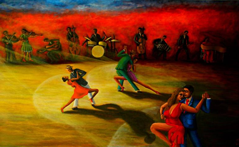 "Impression of dancing music" captures the vibrant energy of a dance festival as night descends. The air crackles with the music's vibrations and the dancers' spirited movements. Vibrant oil colors on canvas vividly depict the high energy atmosphere, channeling the musical band's rhythm and the dan...