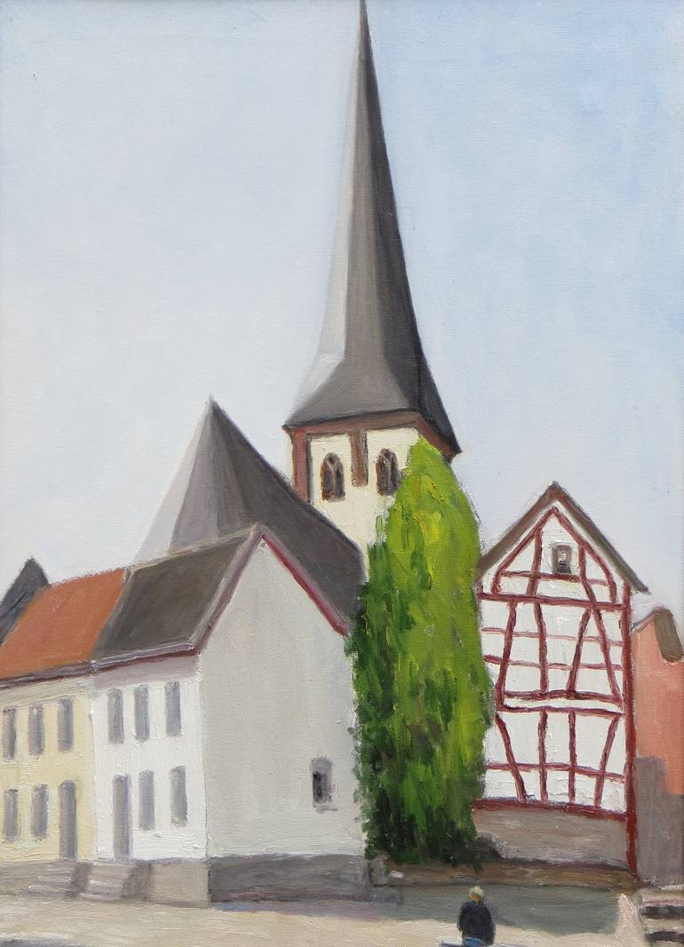 The artist painted this scene on an early warm summer morning in a German town. The painting depicts a church with a tall spire, surrounded by buildings with traditional timber framing architecture. To the right of the church, a tall green tree grows, and in the foreground, a person sits on a bench,...