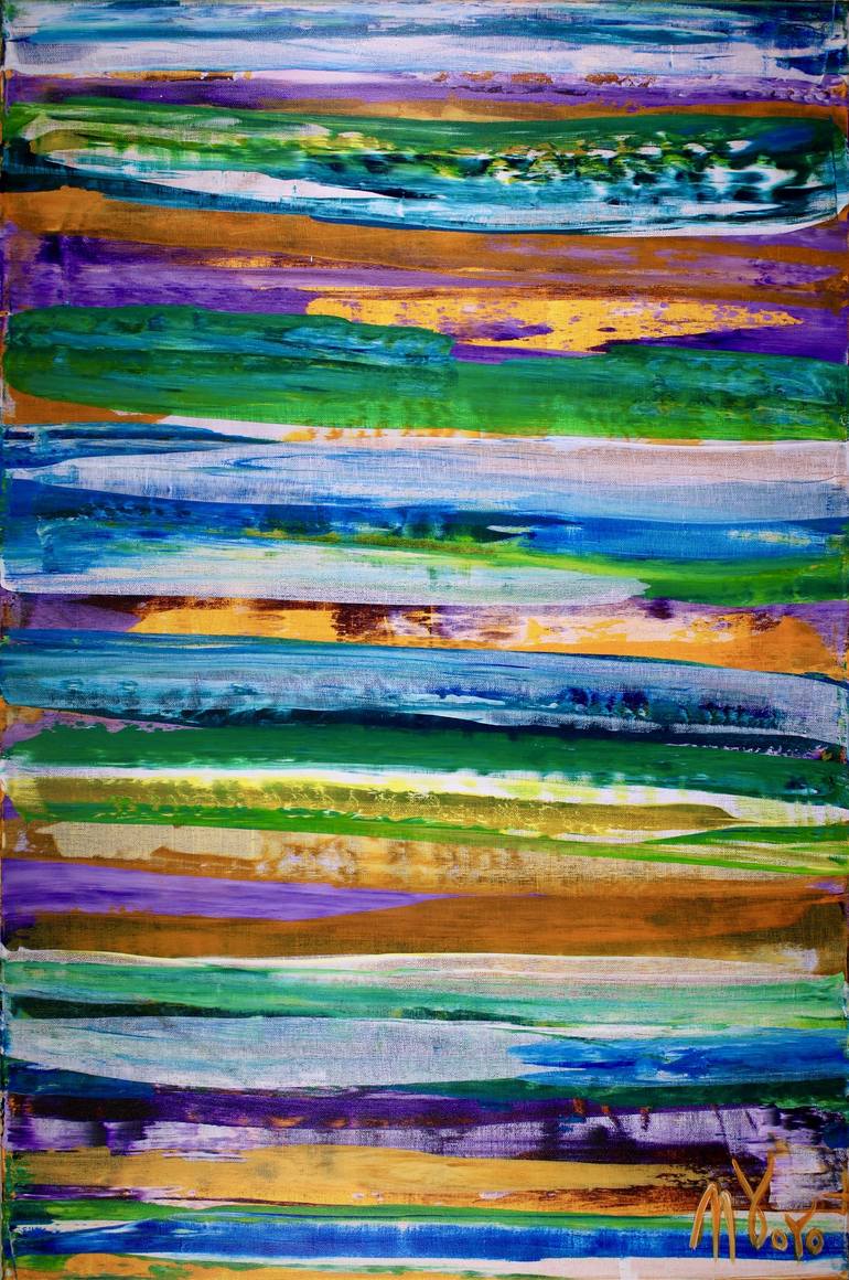 Contemporary abstract acrylic color field. intricate combination of purple, green, yellow, white and blues. This painting arrives ready to hang and signed in front. For this work I used a large palette knife and hand mixed acrylic paint and mediums. The work is completely created spontaneously and ...