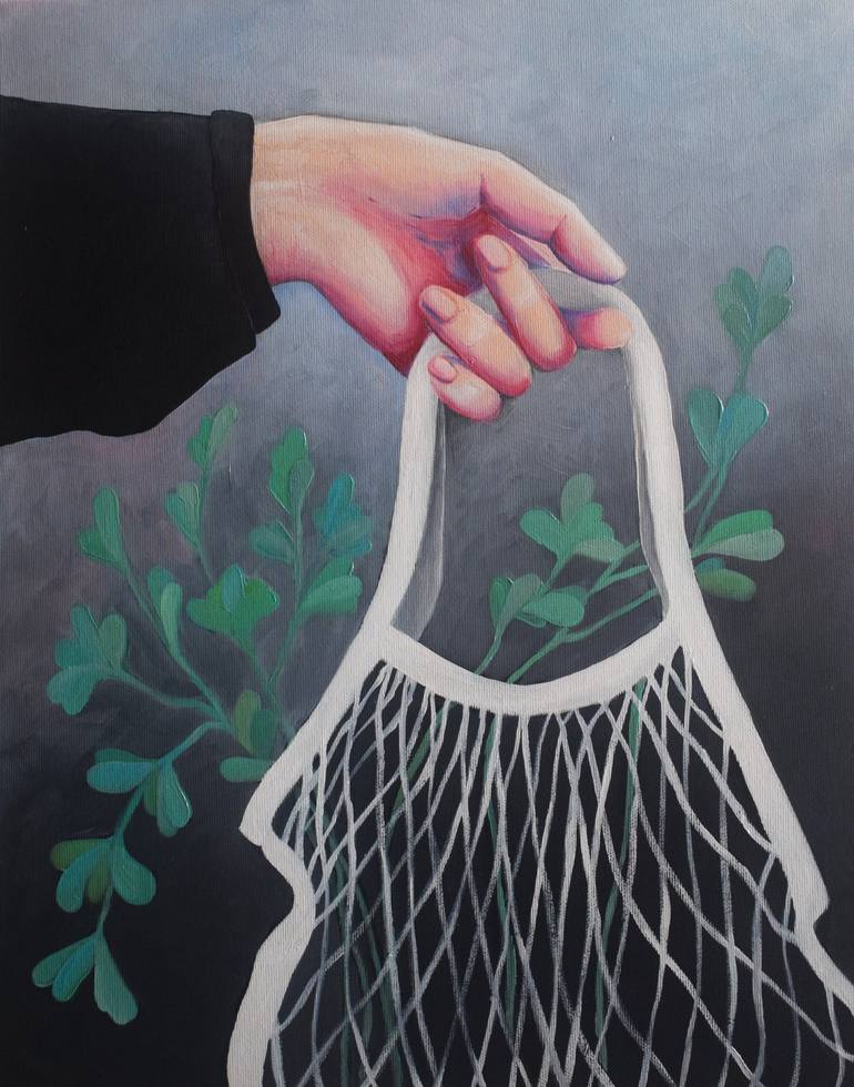 I am women. In my hands is not just a bag with greens, in my hands is care for myself and loved ones, about nature and the environment. I have the power in my hands to make the world a better place. Oil on canvas, 10'2023 Size 40x50cm No frame The work will be packed in a cardboard box with a prot...