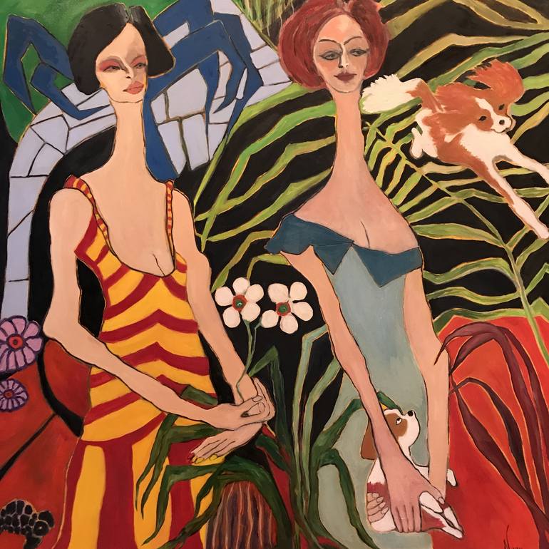 I have three King Charles Cavalier Spaniels and a good amount of time is spent in the garden. This piece represents my home. Although it is always just me and the dogs, I added the other woman. It is currently hanging in my pool house and I receive many compliments on it. It is definitely one of ...