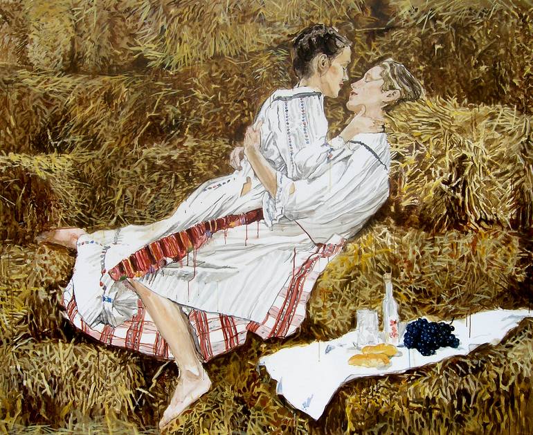 The painting "In the Hay" from the series Young Slavonian Women, explores the queer identity in the rural areas of the Balkan. The painting realistically depicts imaginary scenes from the life of young women, that might have happened but were not historically recorded and were not part of the colle...