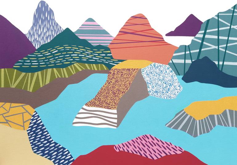 Original large scale landscape painting and beautiful nature view painting (nature, scenery, highlands), 100% handmade colourful acrylic painting titled "In the Mountains 13" was created with bright acrylic colours on top quality 100% linen canvas. My landscapes are both idealized and impossible; t...