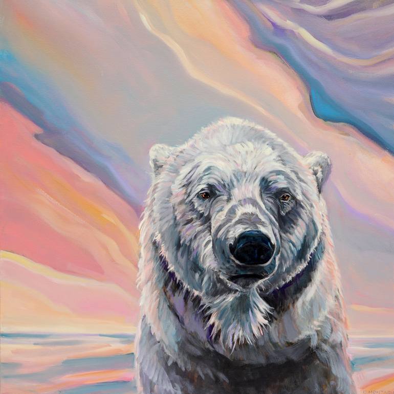 Spring has arrived in the north. The sea ice, so vital to the polar bear's survival is receding. For now, this bear, that looks looks healthy and beautiful in the rosy reflections of the setting sun, is "in the pink" both literally and figuratively. The pinks and corals in this painting are attrac...