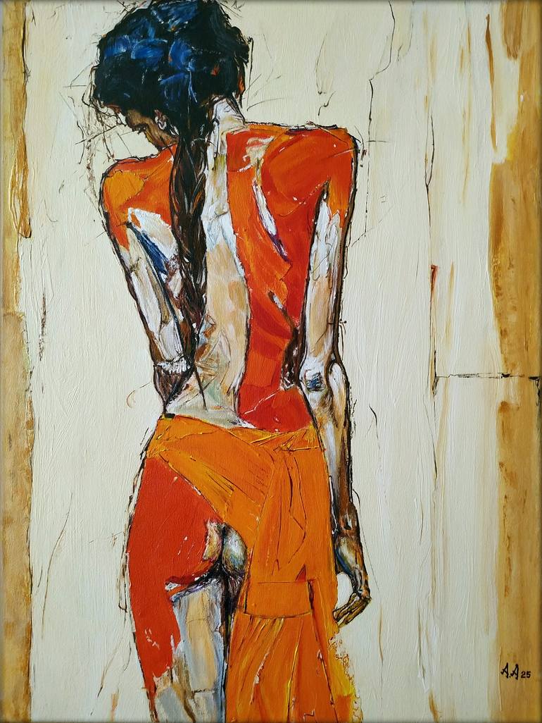 “In the Summer Garden” by Alexander Aksyonov radiates warmth and vitality through its expressive use of color and form. The artwork depicts a woman standing with her back turned, her figure adorned in bold red and orange hues that evoke the richness of summer. Her cascading braid and flowing fabric ...