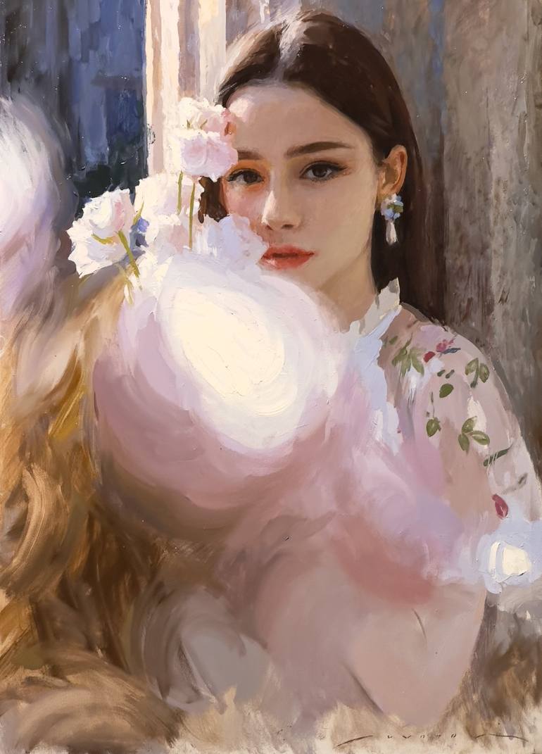 This work is made in the genre of impressionism with elements of abstractionism. The detailed study of the face against the background of large strokes allows viewer to focus on the portrait itself. With this technique, itried to shiw the transience of this beautiful moment