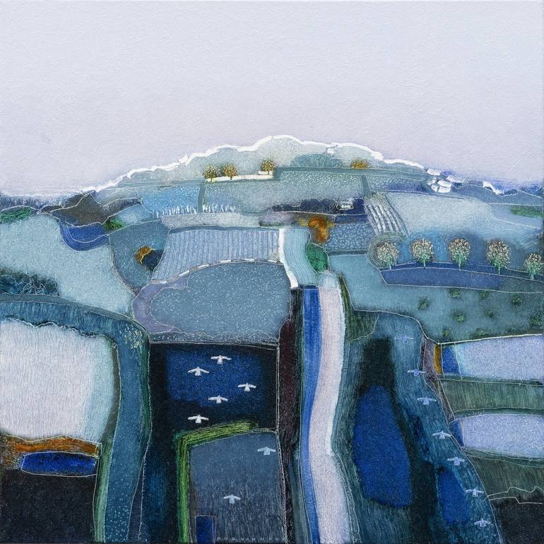 Landscape painting, in a blue palette. Birds fly across the land, giving space to the composition. The title is from a song by Van Morrison. (All the titles of my paintings are parts of song lyrics). The sides of the canvas are painted as well. Framed in a light-colored box-frame, ready to hang.