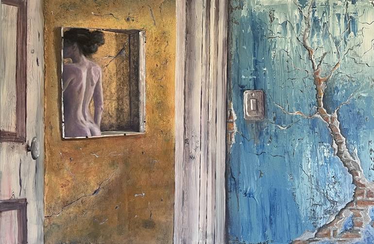 I am researching the abstraction of details in the wall. At the same time, it represents a real wall and an abstraction of patterns that redevelop into new recognizable images. The counterpoint to this rough matter is the image of a woman in the mirror, who stands out from the surroundings with her ...