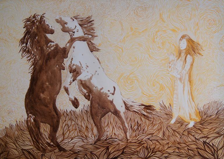 This painting is from a cycle Incarnations. Epona is a Celtic Horse Goddess. Fighting male horses are symbols of patriarchal system taking over matriarchy.