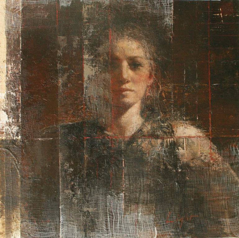 Oil painting of a woman on linen on wood panel. The painting has collage elements. Lots of layers and textures throughout. The size is 26x26 inches.
