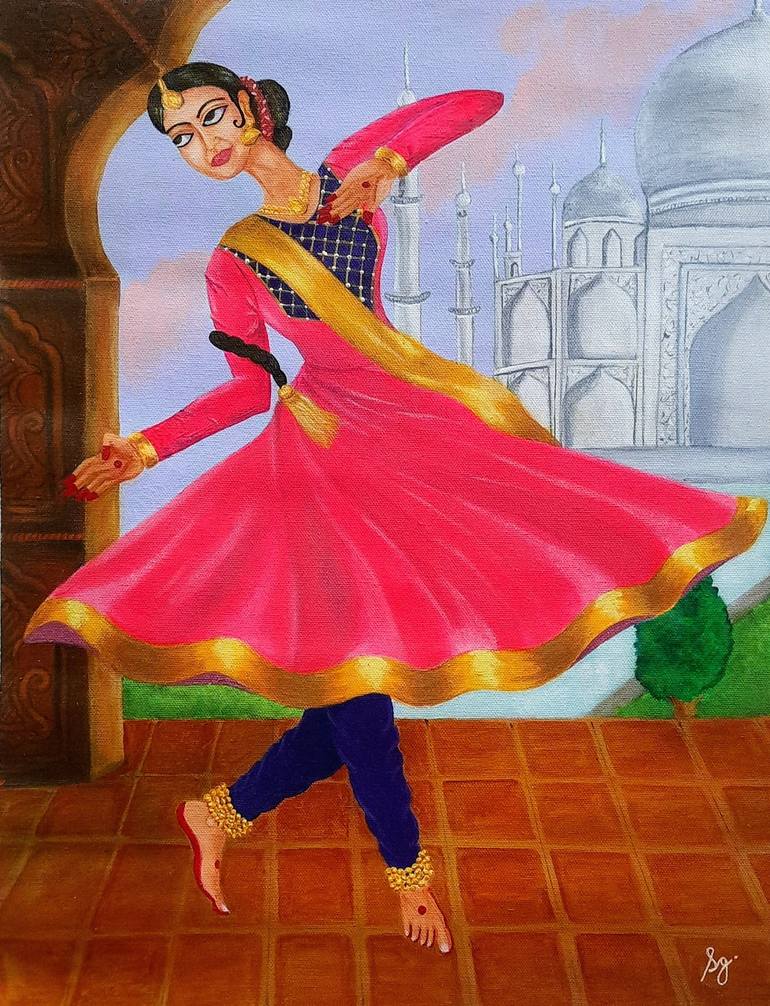 The word Kathak means storyteller, and the dance narrates stories from Hindu epics through expressive movements. This semi-realistic, vibrant artwork captures the essence of the dance with its beautiful facial expressions and strong footwork. The background of the painting is inspired by the Taj Mah...