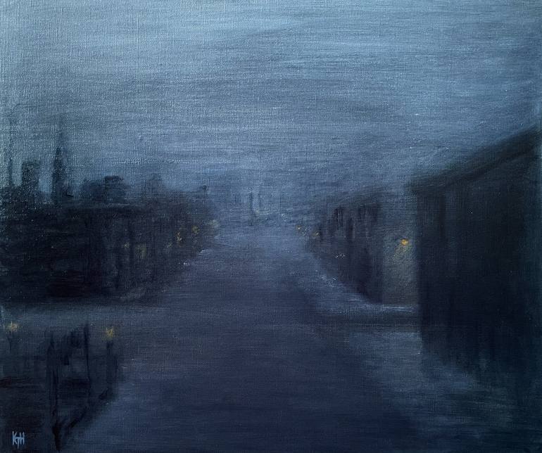 A city scene at night, drawing on inspiration from the atmospheric effects of Whistler's Nocturnes of Victorian London. Oil on canvas, unframed.
