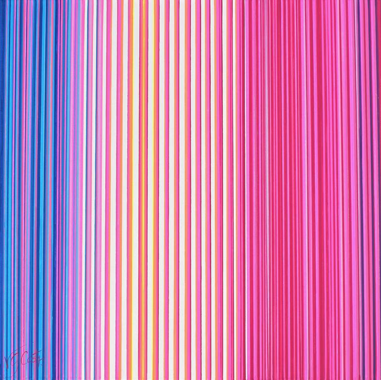 My hand painted work "Infinidad" is inspired by vibrant colors as a way of immersing oneself in joy and hope. This painting is one of a kind and somehow is connected with my wall sculptures -Roble and Carbon Series-. Lines that fall perpendicularly and create a three dimension feeling when work is ...