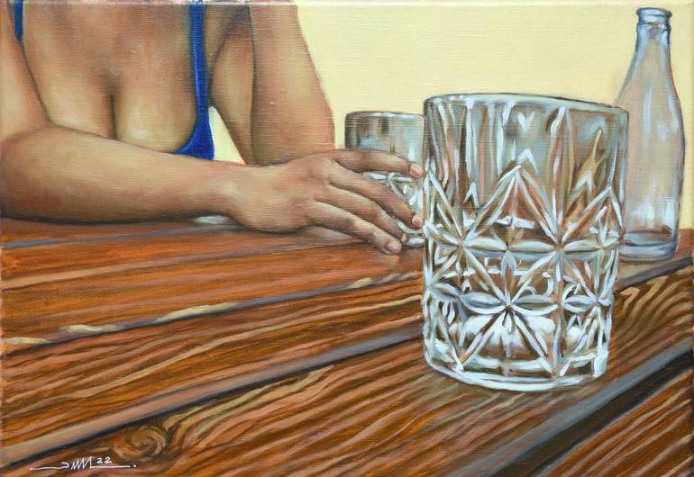 Peinture à l'huile sur toile réaliste représentant un verre sur une table en bois avec un personnage en arrière plan.