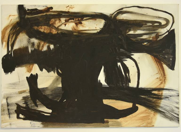A dark center piece hovers over the white background mingled with black and brown shades smudged into this abstract art that exemplifies creativity in every sense. The large focal black figure seems to overshadow everything around it, but a backdrop of lite smudges offers a frame that steals the foc...