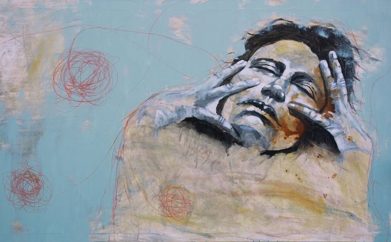"Insight-Outlook 3" is a captivating modern painting that invites contemplation. Acrylic and pastel come together on canvas to create this large figurative piece, where a woman is depicted with closed eyes, lost in thought. The artist's expressionistic style brings forth a sense of depth and emotion...