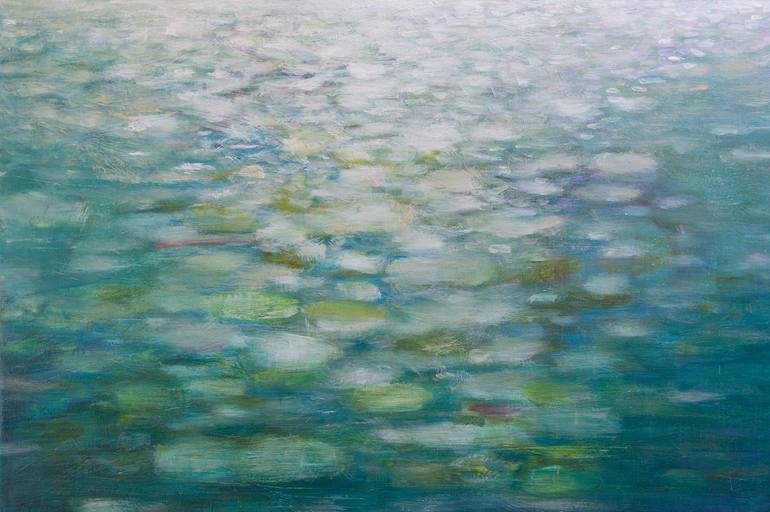 An impressionistic painting of clouds reflecting in a pond, in my favorite color, turquoise. Other deep blues of royal and aqua with a touch of green create a colorful landscape with water glistening under indulgent clouds.