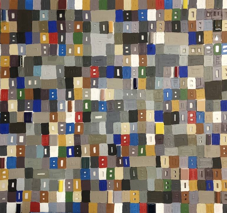 "Integrated" is an abstract reference to diversity in suburban neighborhoods. It is a social and political comment on stereotypes and bias regarding race, social status and location. Acrylic and ceramic tiles on clear panel. Mounted on natural contemporary wood box frame. Wired and ready to hang...