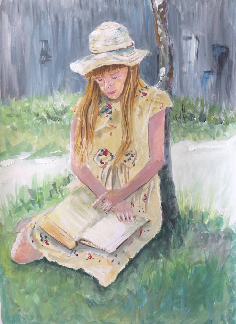 "Interesting Story" - Original gouache with acrylic painting on paper. This is part of a series of paintings depicting people and children reading. Photo reference from -