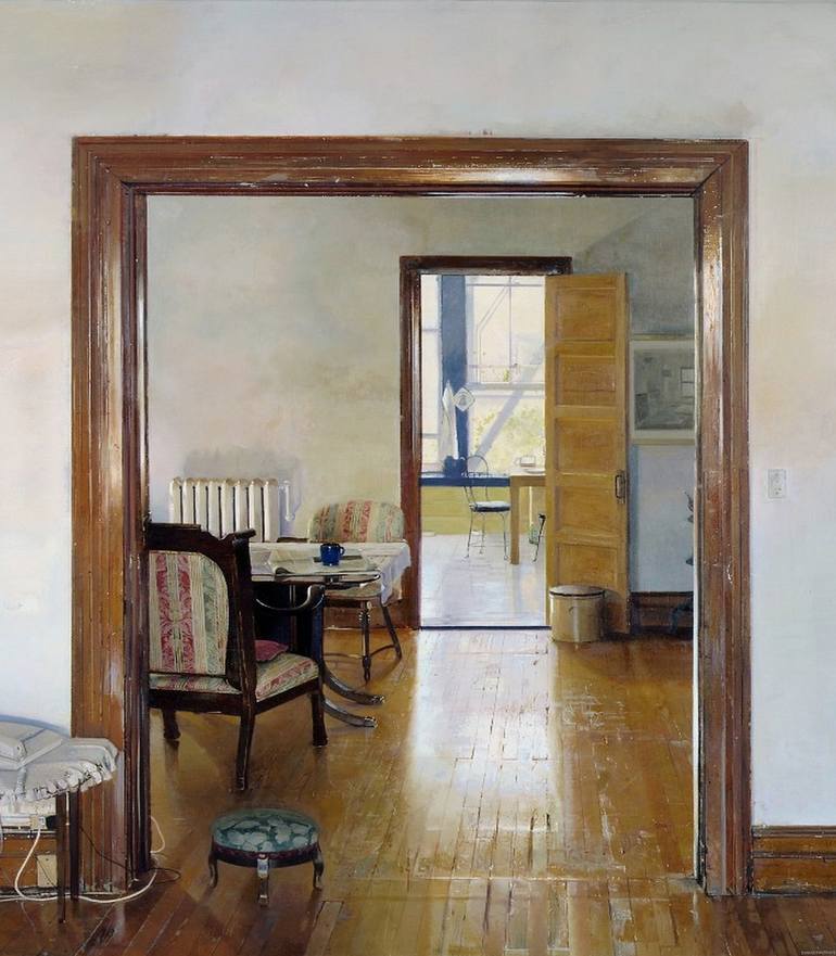 Christopher Gallego, Interior with Three Rooms, 2002, Oil on canvas, 90 x 72 in., New Britain Museum of American Art Sold Inspired in part by Velazquez' masterpiece Las Meninas, this painting of the artist's studio represents Gallego's largest and most ambitious work. Painted from life from 1996 to...